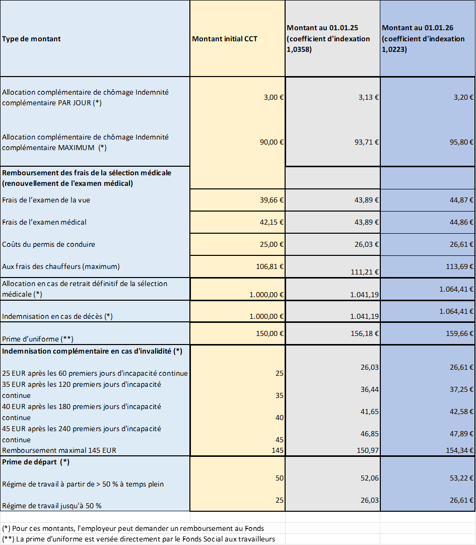 Au 1er janvier 2026, les montants suivants ont été indexés dans la convention sectorielle du 21 septembre 2023 relative aux avantages octroyés aux des travailleurs